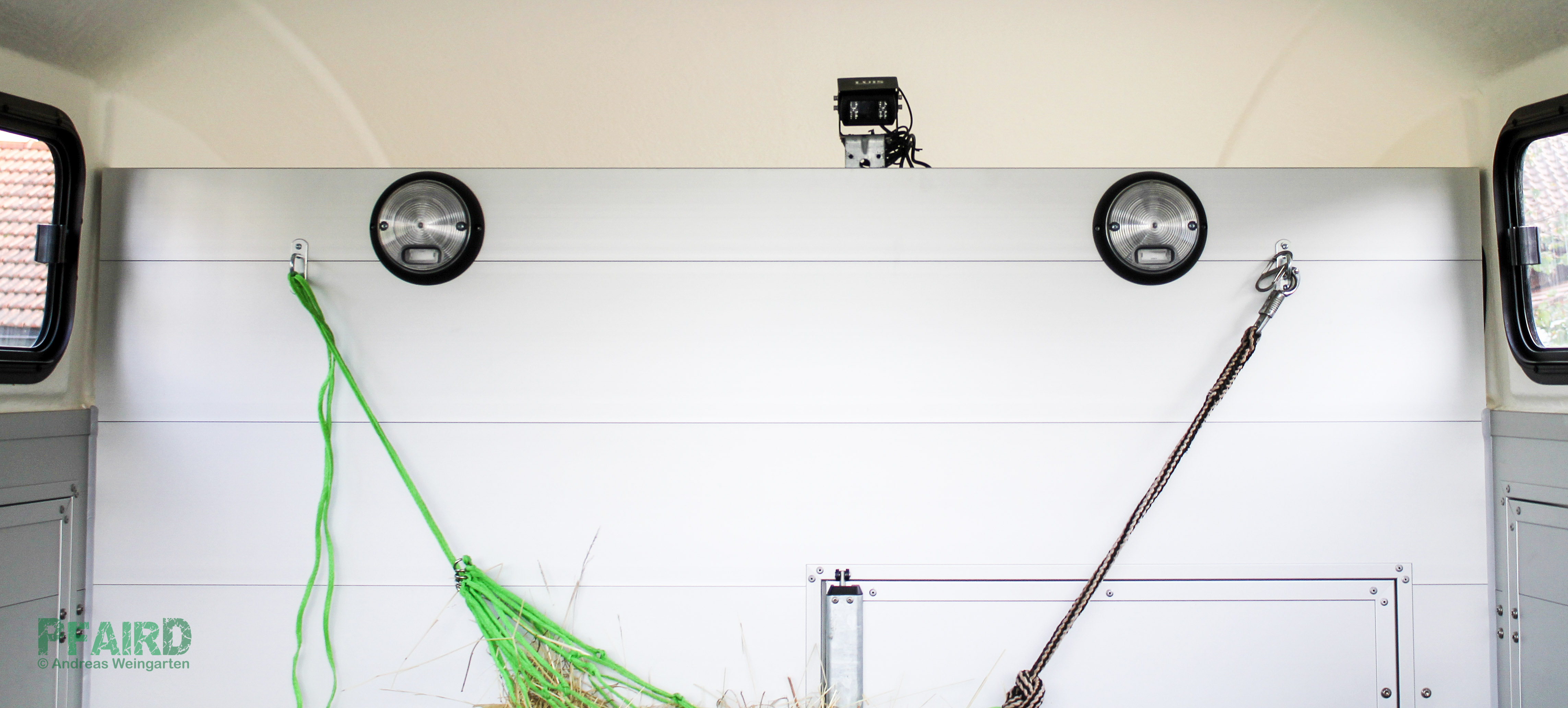 Auch eine Nachtsichtmöglichkeit sollte eingebaut sein, da die Hängerbeleuchtung für ein scharfes Bild nachts zu wenig Leistung hat. Wir lassen die Beleuchtung im Hänger dennoch immer an, da somit die Umweltbeleuchtung z. B. durch folgende Fahrzeuge oder Strassenbeleuchtung nicht so massiv auf das Pferd wirken.